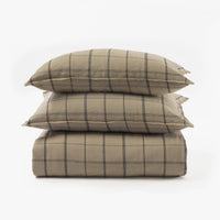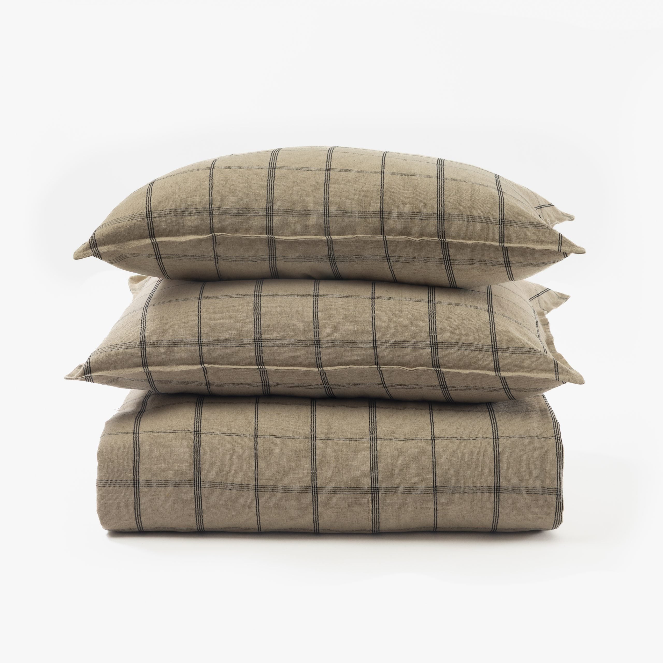 Tailored yet relaxed, this windowpane duvet cover is crafted from a breathable cotton-linen blend that brings together the crisp structure of linen with the softness of cotton. The classic grid pattern offers quiet refinement, rendered in muted tones that suit both modern and traditional settings. With its subtle texture and versatile palette, this piece sets a grounded, architectural foundation for layered bedding looks.
