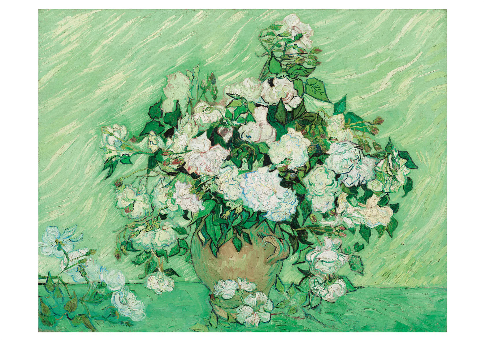 A voluminous bunch of white roses is paired with a windswept landscape in this notecard duo. Van Gogh’s signature brushwork adds dimension and motion to each painting. The sky in Green Wheat Fields, Auvers is boisterous in its swirls and colors, while the vase of roses can barely contain its floral abundance Contains five each of the following notecards: Roses, 1890 Green Wheat Fields, Auvers, 1890