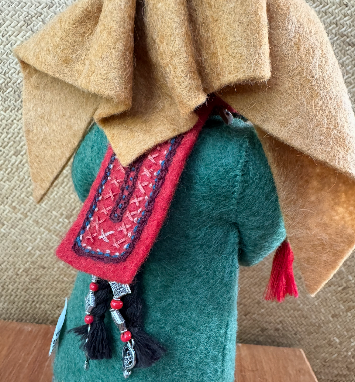 Erkebu Djumagulova is a professional textile designer from Kyrgyzstan. She gets inspiration from the stark Kyrgistani landscapes and the vibrant traditional Kyrgyz dress. Her dolls depict scenes from everyday, rural Kyrgyz life. Each doll is dressed in traditional costumes with hand embroidered designs and an exquisite attention to detail.