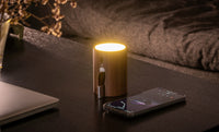 A minimalist silhouette with a sturdy natural wood base and softly glowing top – stylish, subtle, and space-saving.