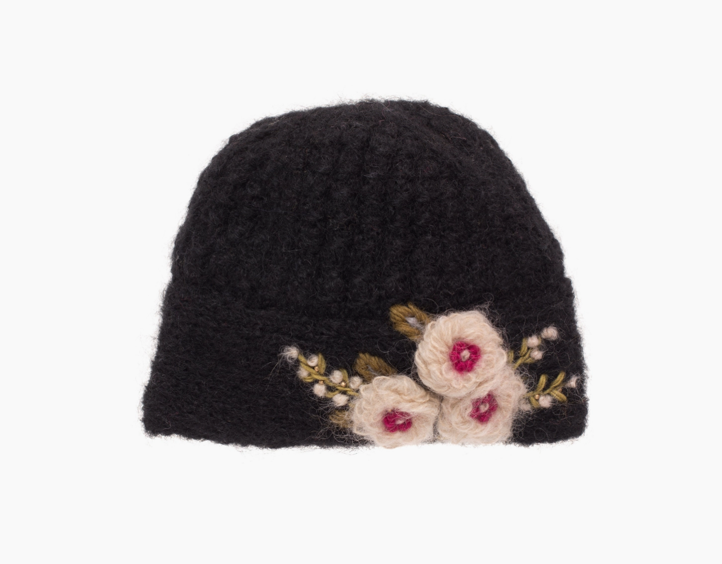Soft and elegant floral details make the Mae Cloche a timeless style. The cloche-like fit is the perfect blend of modern and vintage. Mohair wool blend, partial fleece lining. Handmade in Nepal.