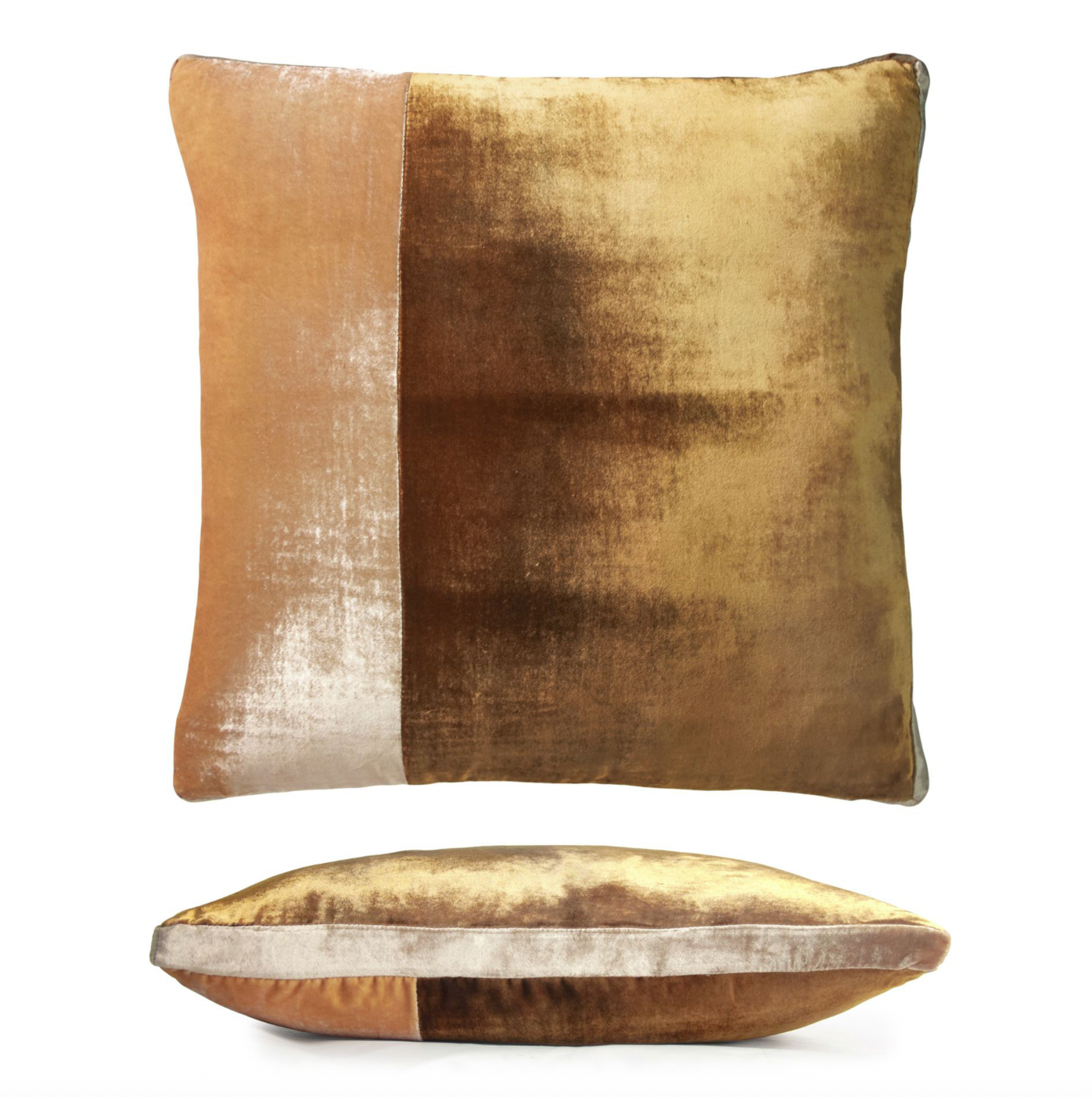 Patches of shining velvet colors are united into a coordinated palette on each of Kevin O'Brien color block pillows.