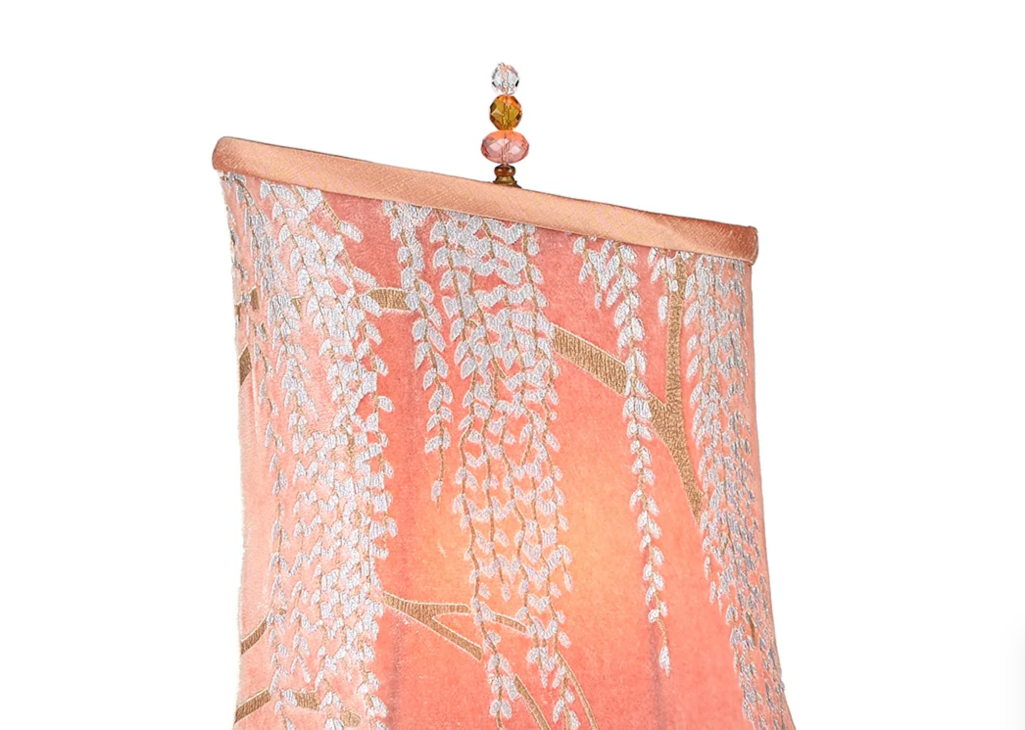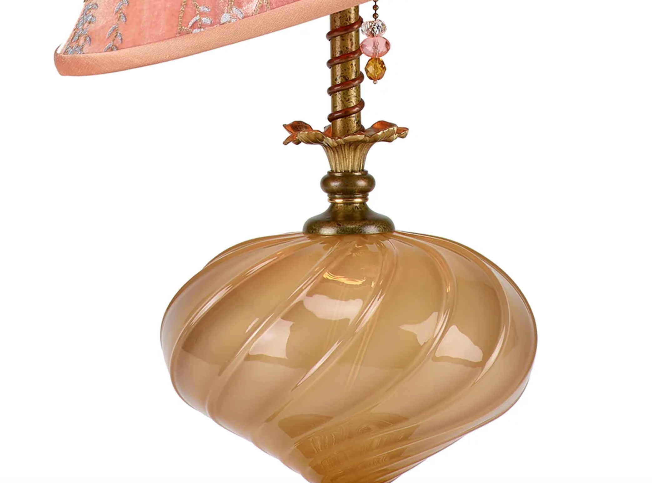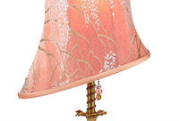 Andrea is a striking lamp with its gold, hand blown glass and a unique asymmetric shade covered with hand painted "Willow" fabric designed by Kevin O'Brien Studio in the mango color. It has copper wire coiled around its brass pole and is topped with a beaded finial. Andrea has a single bulb socket.