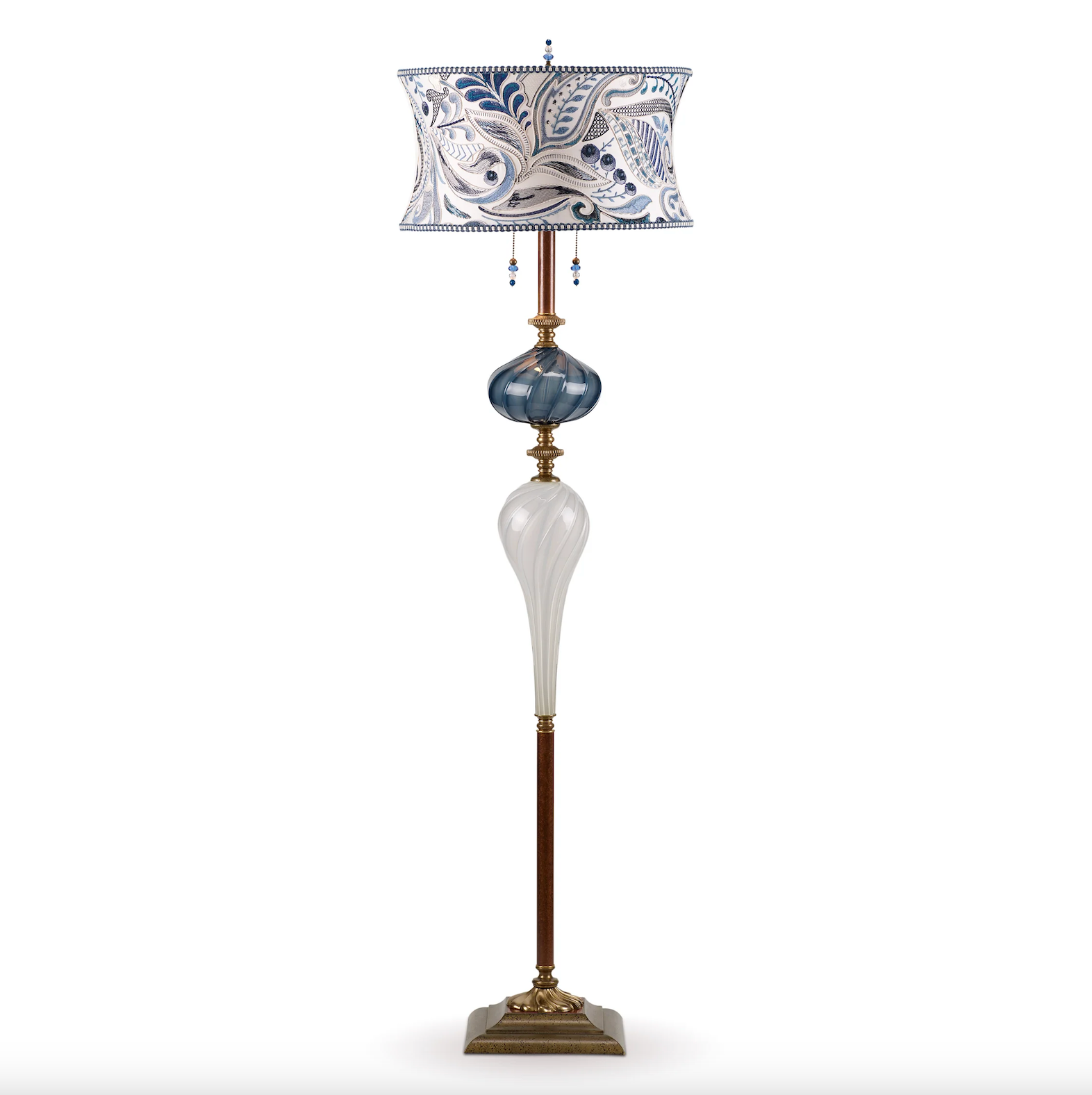 Evaristo is a sophisticated floor lamp with white and blue blue blown glass pieces; its corset drum shade is covered with an intricate embroidery in blue and white. Evaristo has a double bulb socket and is finished with two beaded pulls and a beaded finial.