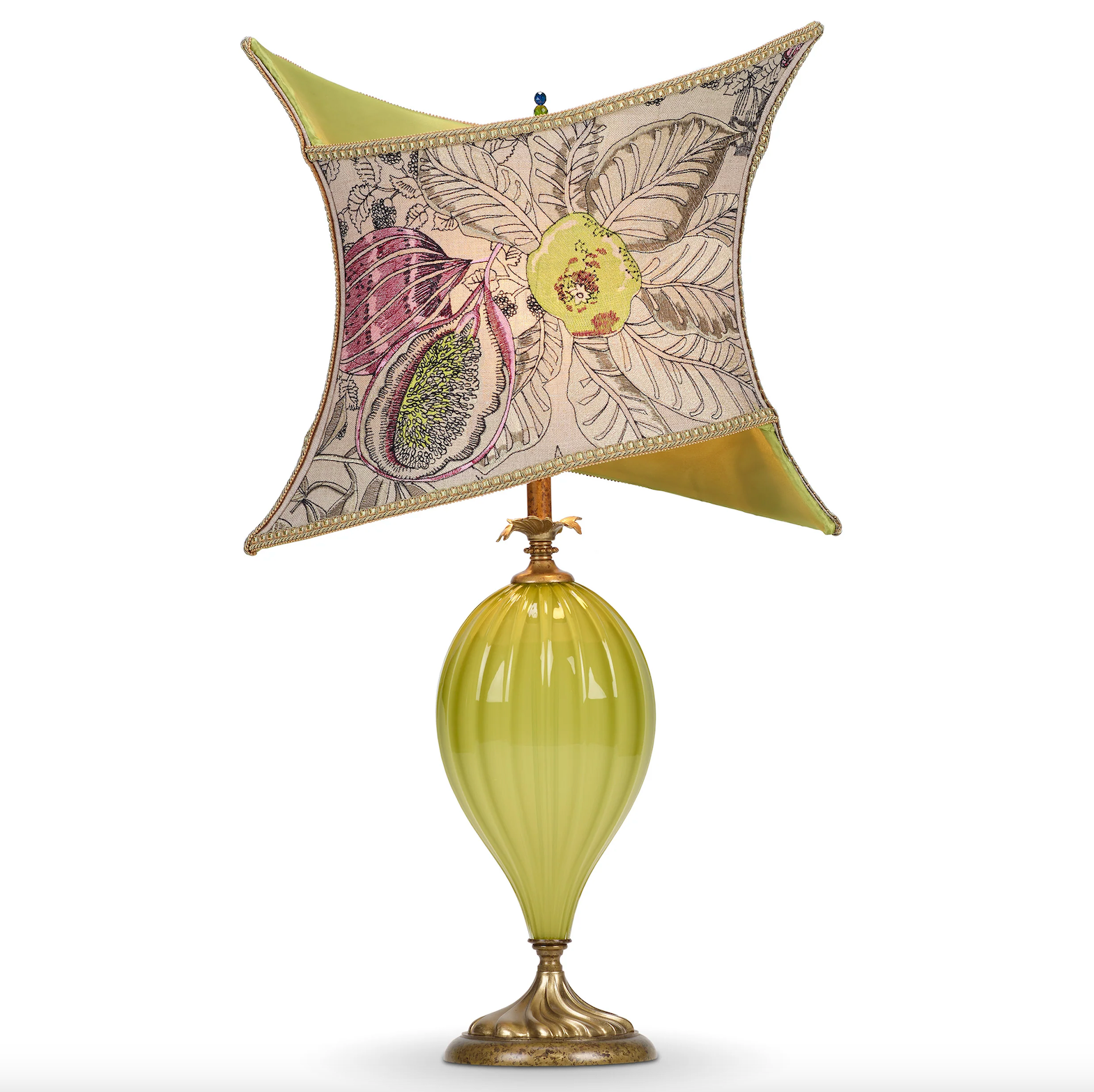Marie is a striking table lamp with a graphic abstract embroidered fabric on a unique envelope shaped shade. The shade is matched with green blown glass. Marie has a single bulb socket and is adorned with a beaded finial