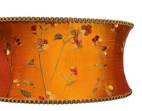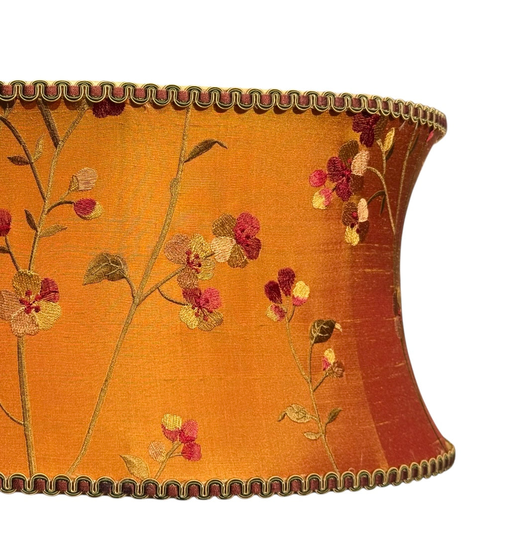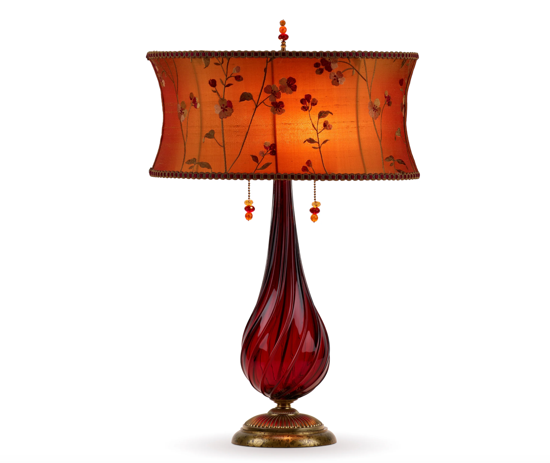 Harper is an elegant lamp with deep red blown glass and an oval shade covered in orange silk with a floral design. Harper has a double bulb socket and is finished with beaded pulls and a beaded finial.