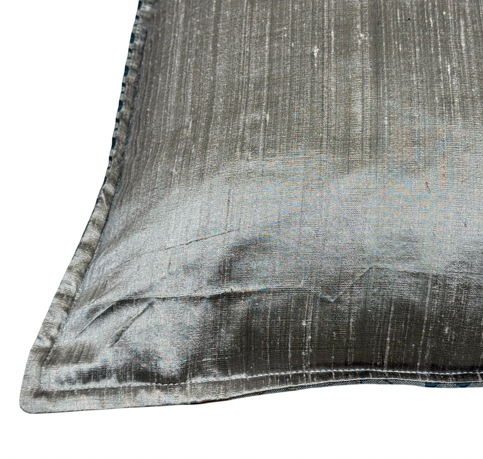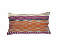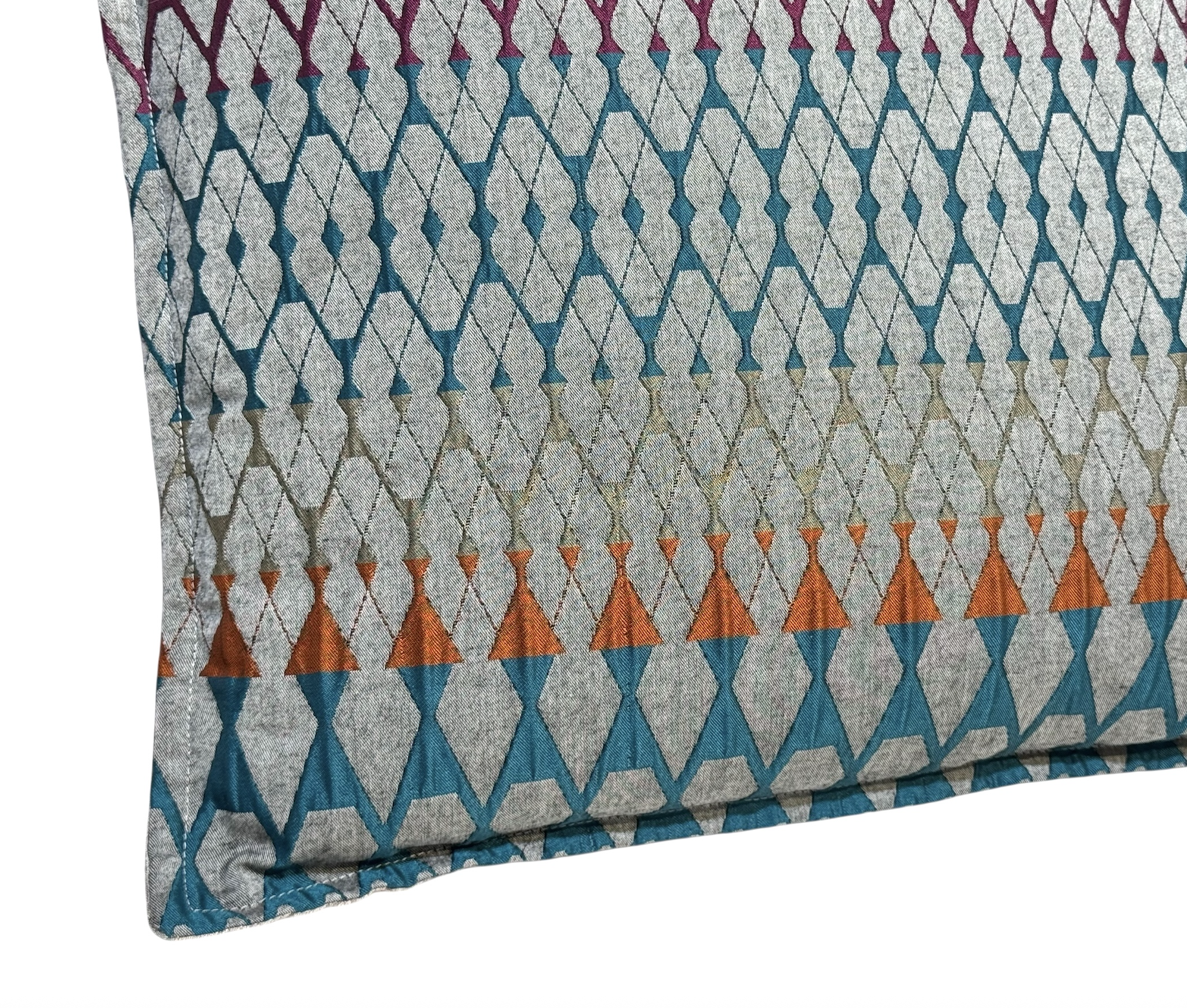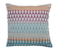 Constructed from small graphic shapes inspired by the forms found in cut glass, Algarve cushion is woven in a fresh palette of contrasting orange, yellow and teal. The textural quality of this jacquard fabric is achieved through a double-weave process; interwoven mixed fibres, including a heat-shrink yarn, create a tension in the cloth for an embossed surface – a Margo Selby signature structure.