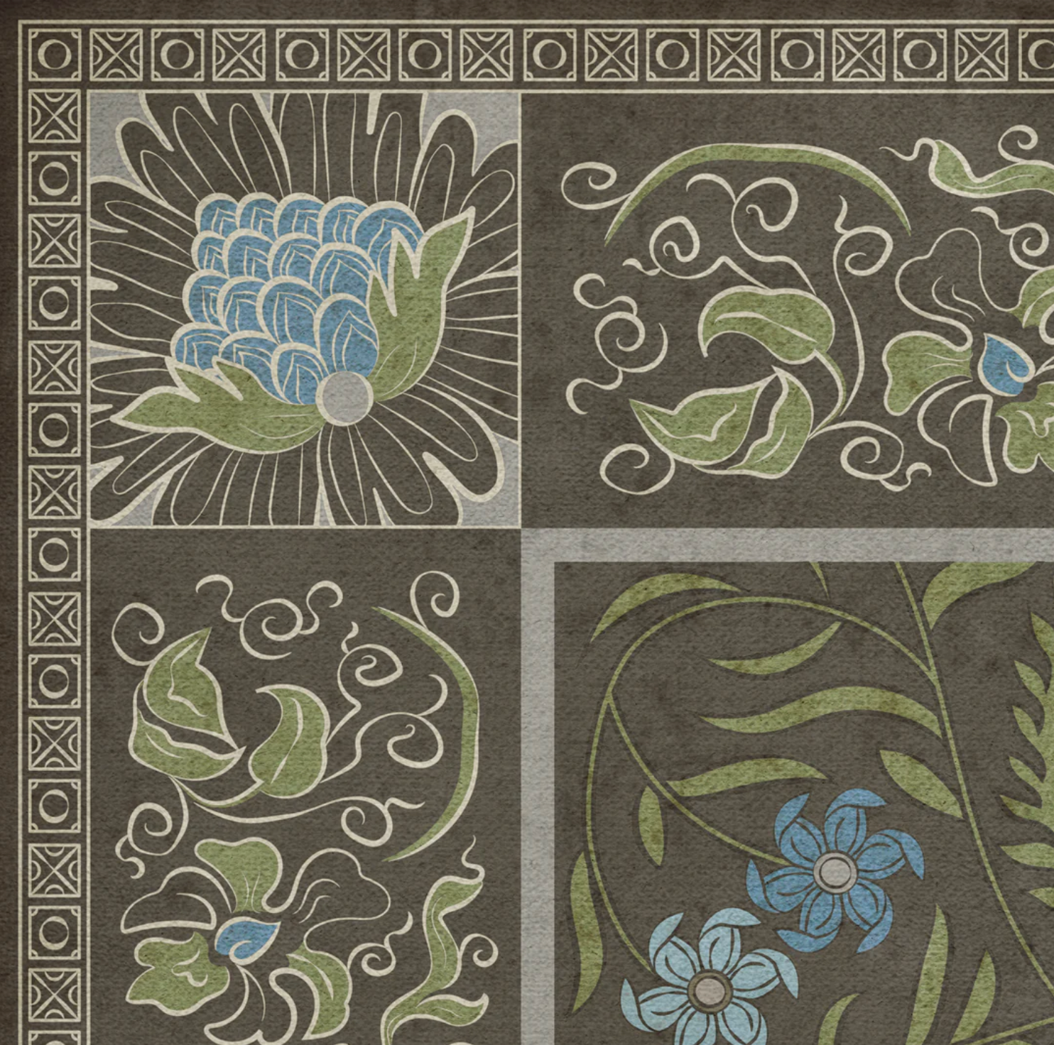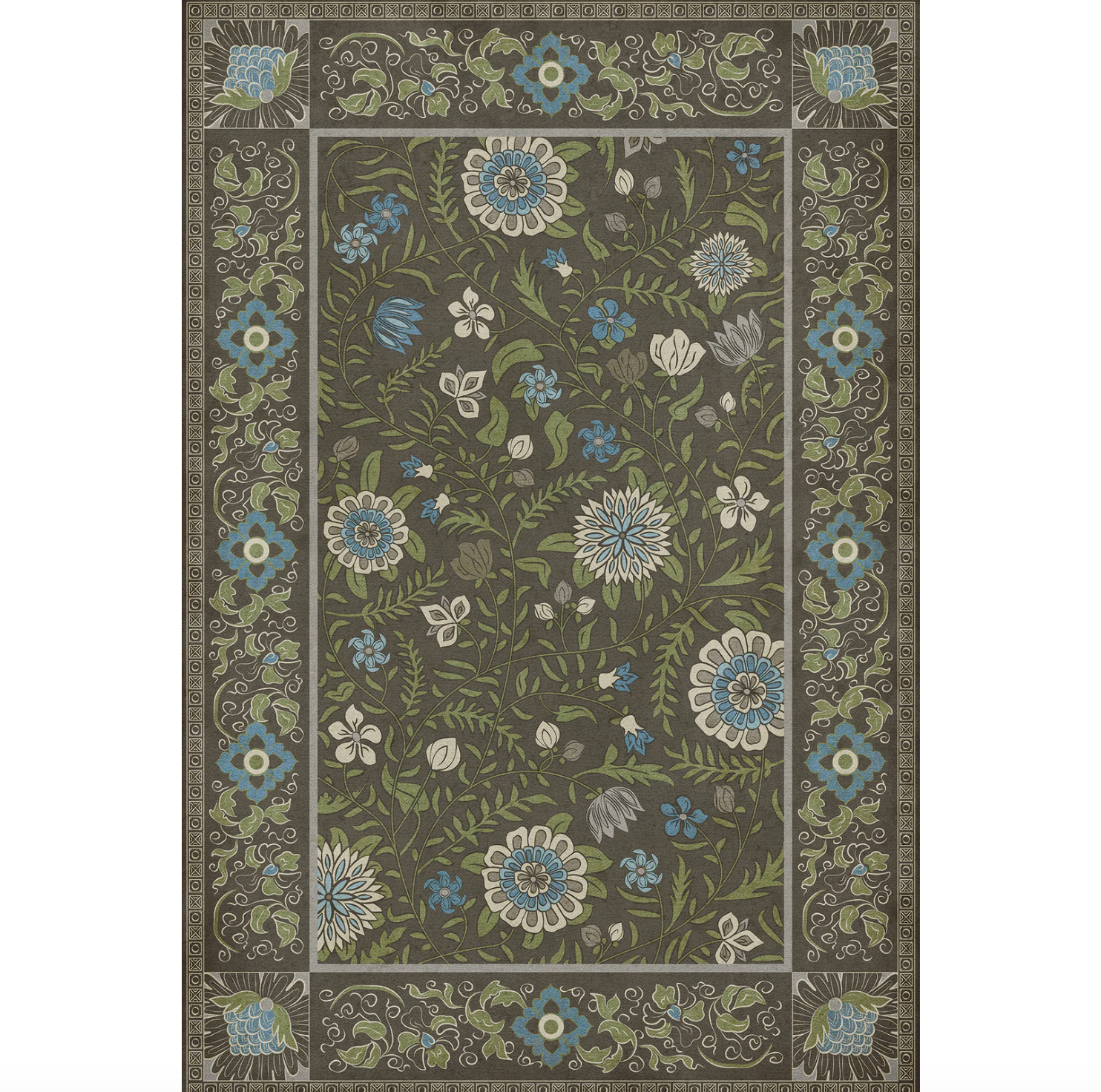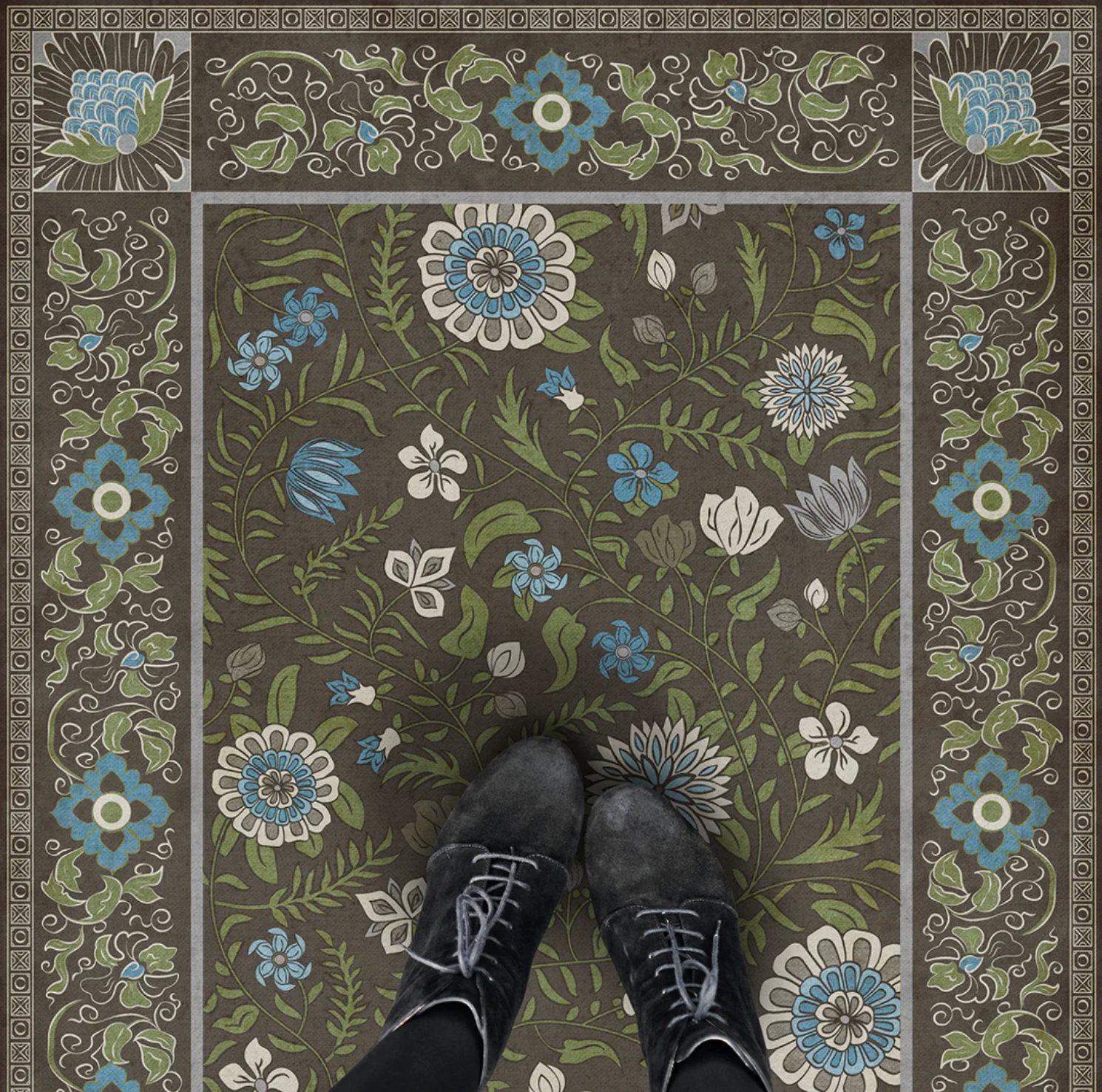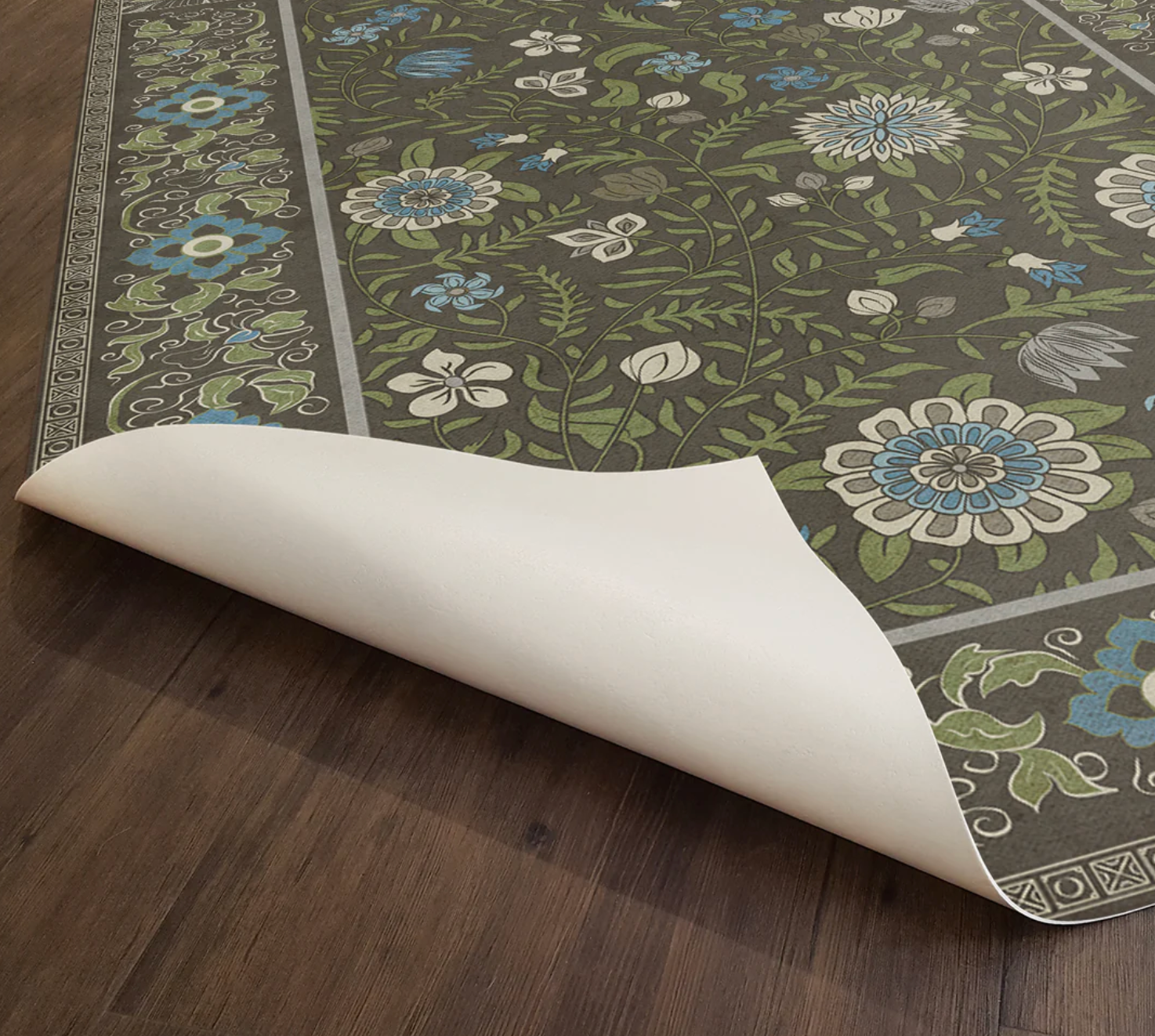Vintage Vinyl floorcloths are made with two-ply vinyl that has a latex padded backing. It is about 1/16” thick and can fit under most doorways. The material is lay flat and has a certified non-slip surface. It is non-flammable, does not contain harmful phthalates, and UV-resistant for up to three years.