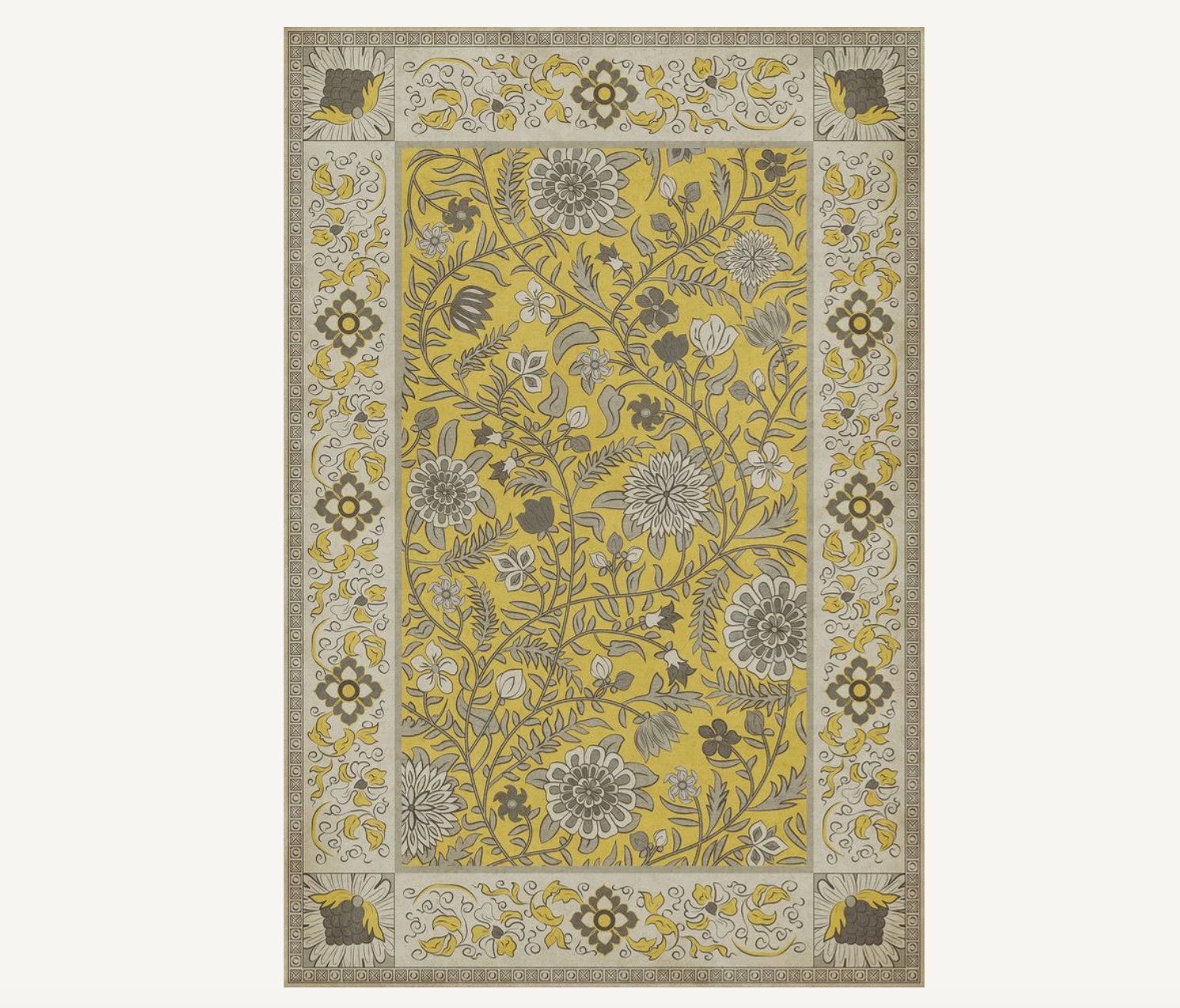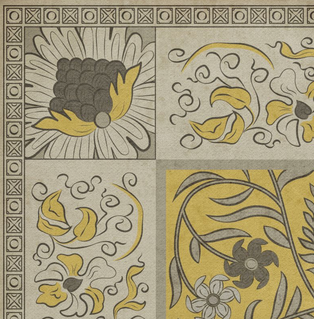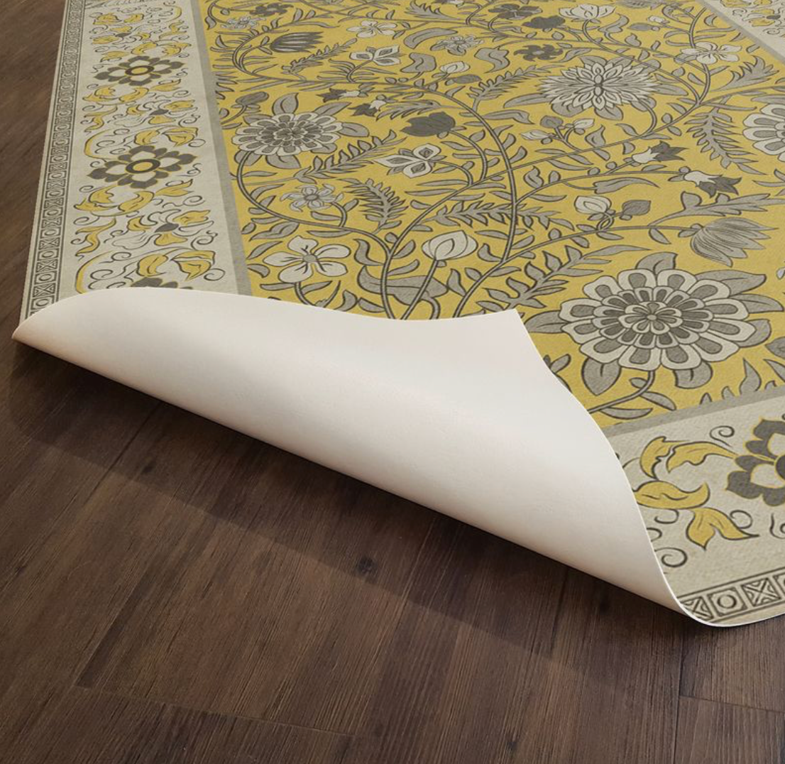 Vintage Vinyl floorcloths are made with two-ply vinyl that has a latex padded backing. It is about 1/16” thick and can fit under most doorways. The material is lay flat and has a certified non-slip surface. It is non-flammable, does not contain harmful phthalates, and UV-resistant for up to three years.