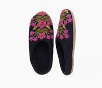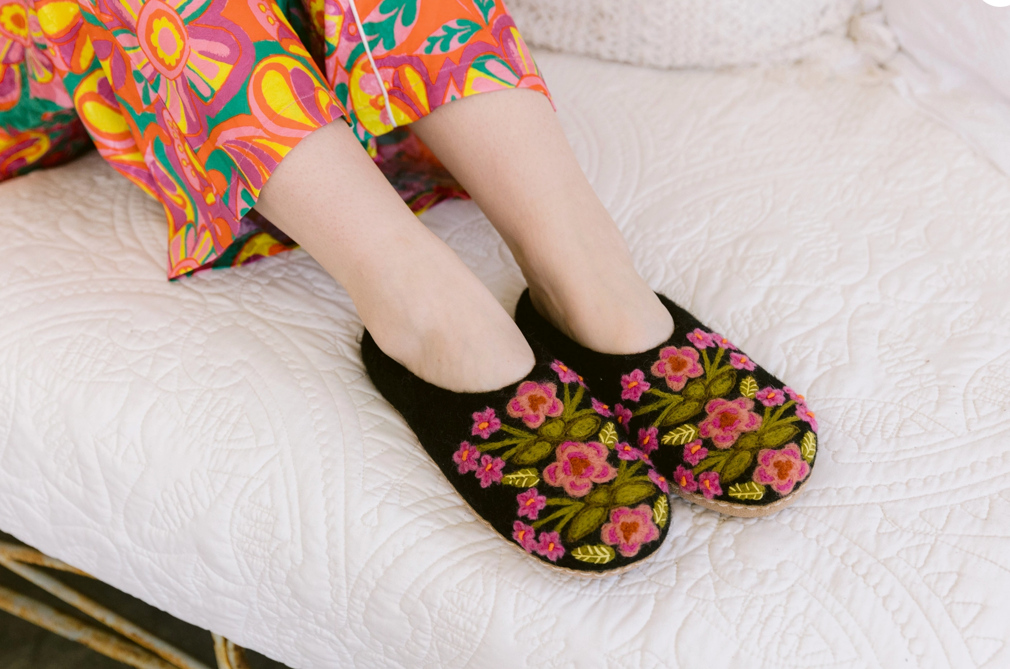 Take your lovely garden inside with you with these elegant Secret Garden Slippers. Inspired by ornate vintage slippers from the 1920’s, each one is hand felted and hand embroidered by artisans in Nepal. Featuring intricate and bright floral embroidered designs that pop against the mustard, red, and pink wool. These cozy and warm slippers are handmade with care and sure to delight.