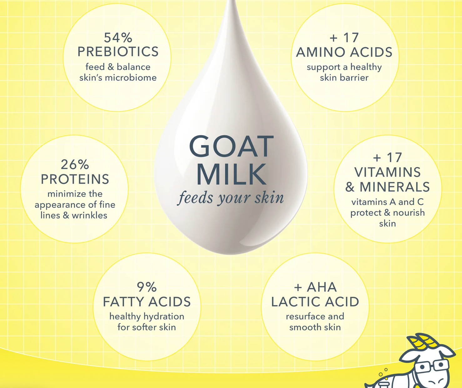 - Goat Milk boosts skin health with the same pH as human skin, and it’s rich in lactic acid, vitamins, and minerals to help renew and strengthen skin