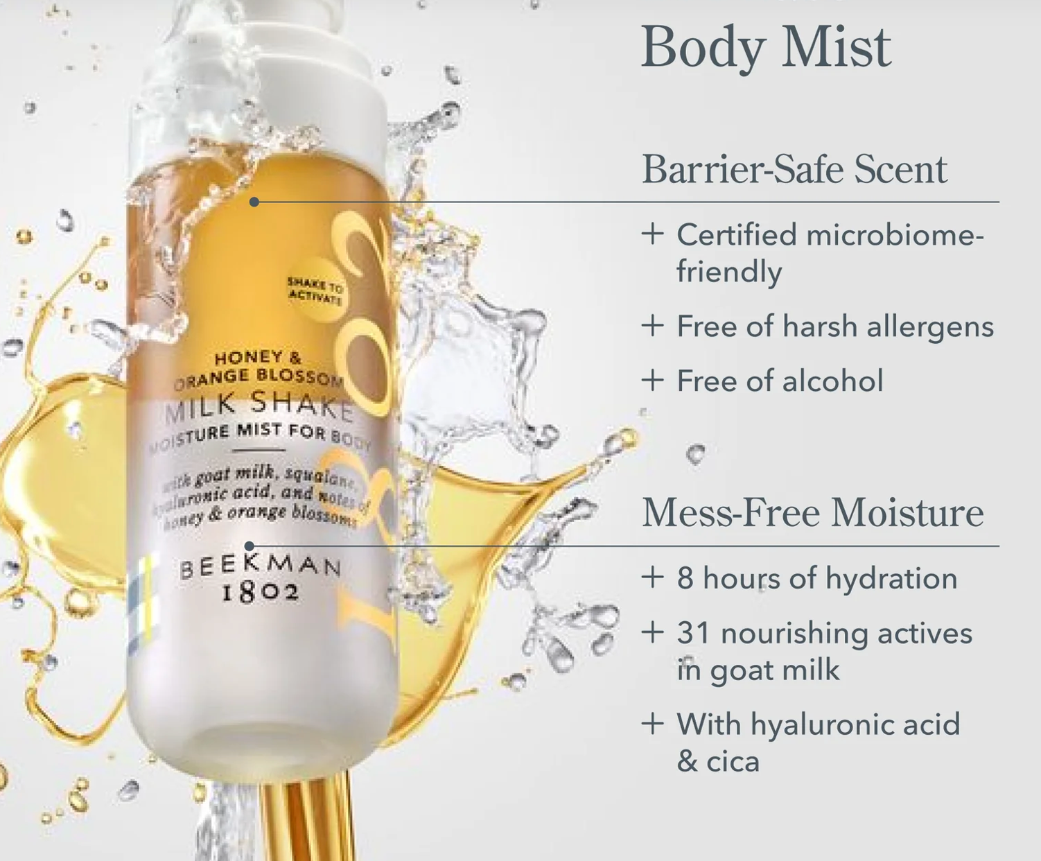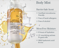 Honey & Orange Blossom Milk Shake Moisture Mist for Body: Water/Aqua, Ethylhexyl Palmitate, Caprylic/Capric Triglyceride, Butylene Glycol, Propanediol, Coco-Caprylate/Caprate, Simmondsia Chinensis (Jojoba) Seed Oil, 1,2-Hexanediol, Betaine, Sodium Chloride, Fragrance (Parfum), Benzyl Benzoate, Curcuma Longa (Turmeric) Root Extract, Limonene, Hydroxyacetophenone, Artemisia Capillaris Extract, Squalane, Fragaria Ananassa (Strawberry) Seed Oil, Rubus Idaeus (Raspberry) Seed Oil, Cocos Nucifera (Coconut) Fruit Extract, Ethylhexylglycerin, Eclipta Prostrata Extract, Melia Azadirachta Flower Extract, Melia Azadirachta Leaf Extract, Corallina Officinalis Extract, Melia Azadirachta Bark Extract, Moringa Oleifera Seed Oil, Saccharomyces/Rice Ferment Filtrate, Ocimum Sanctum Leaf Extract, Benzyl Salicylate, Citral, Citronellol, Pentylene Glycol, Hyaluronic Acid, Caprae Lac (Goat Milk), Tocopherol, Centella Asiatica Leaf Extract ... and Kindness.