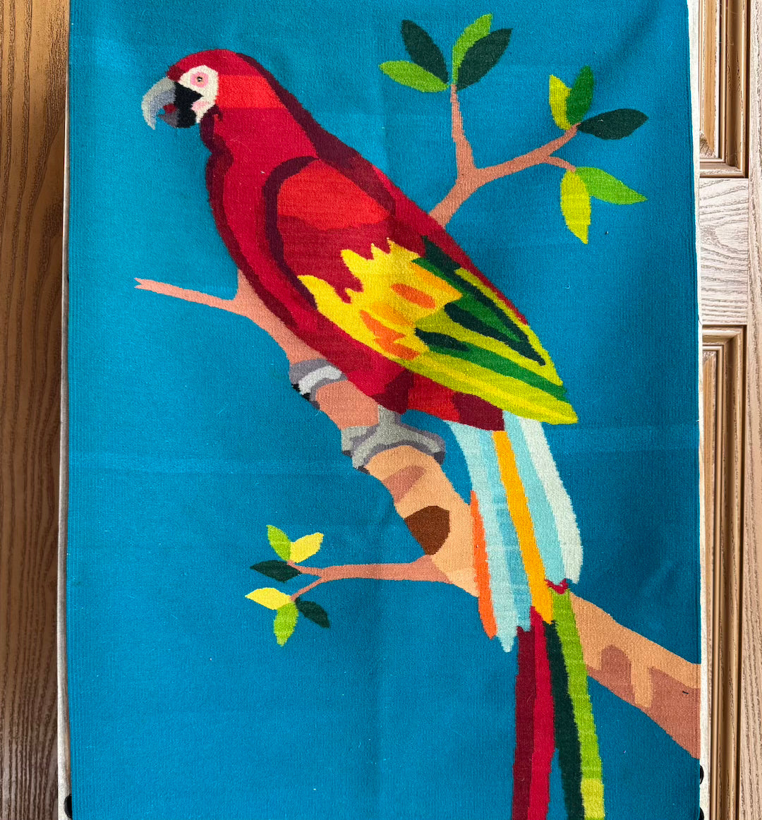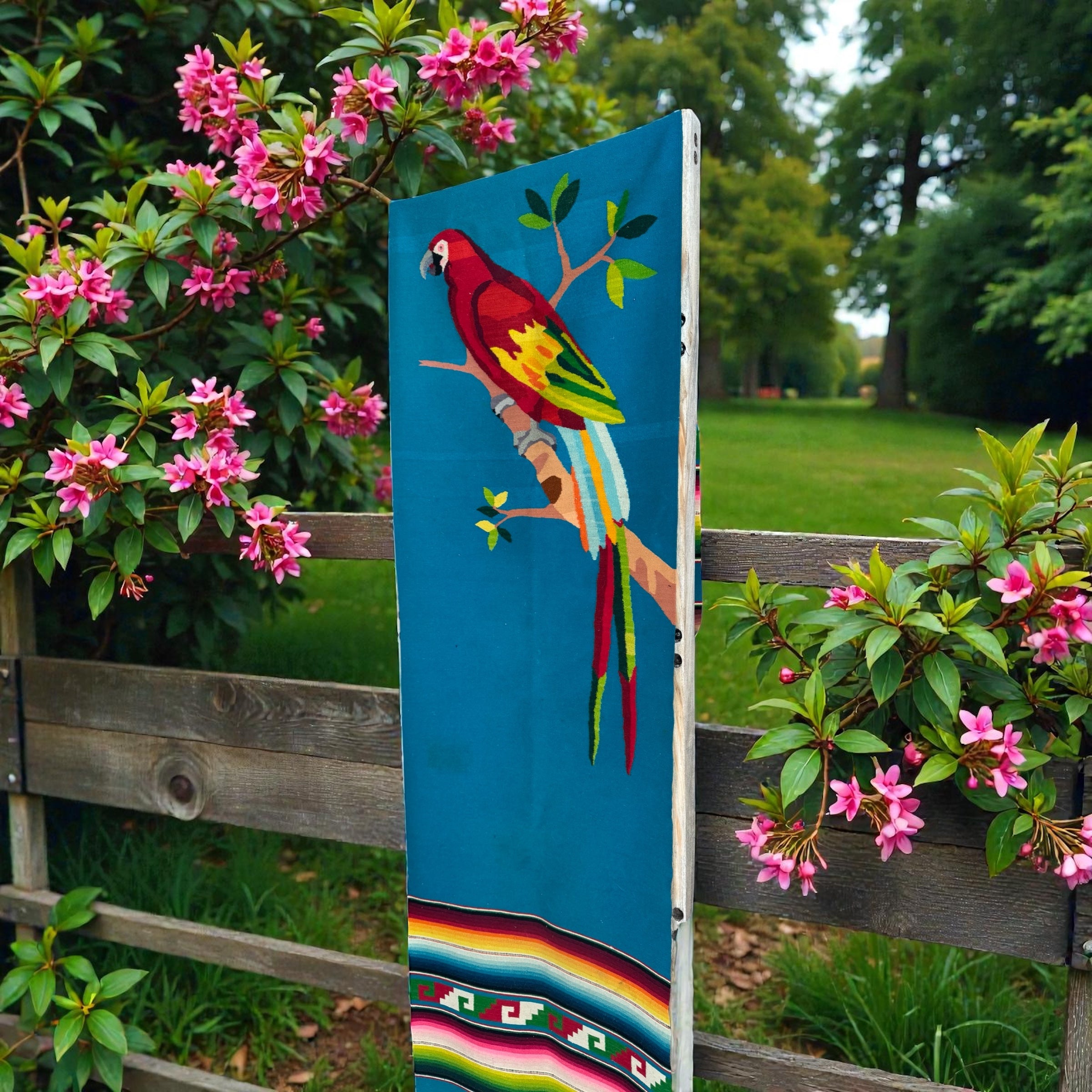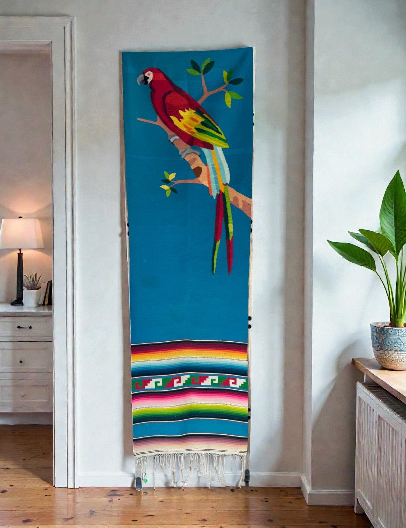 *Long runner with the colorful stripes and fringe on top and bottom and a "papagayo" (macaw) in the center.