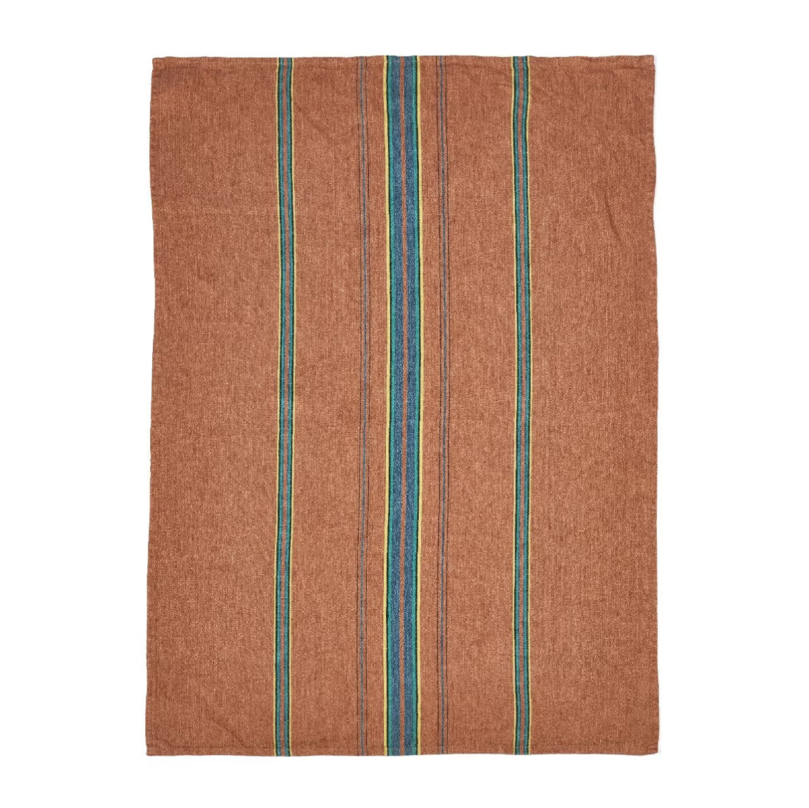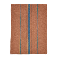 Classic table linen fabric in a pure linen herringbone. The green, blue, yellow, black multi-colored stripes sit on a terracotta ground. It is an autumn collection through and through.