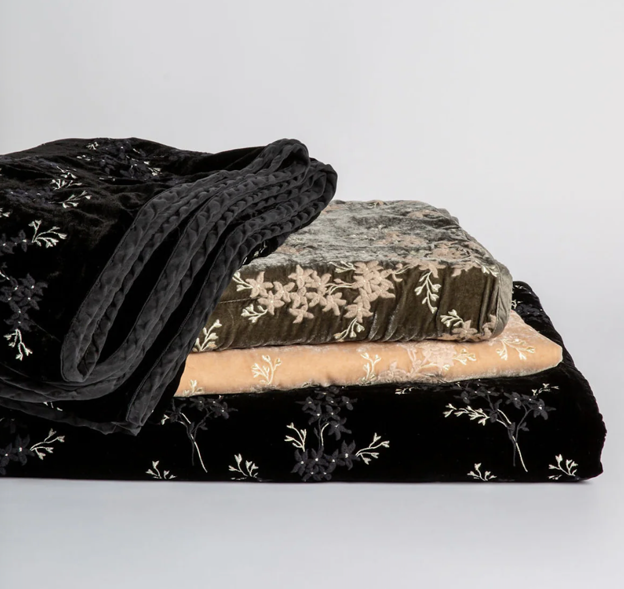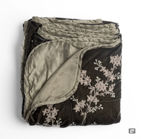 Inspired by vintage chinoiserie, the Lynette Blankets feature floral embroidery with pale gold accents on softly textured silk velvet. Offered in two different styles, the bed end blanket is lightly padded and backed in easy, elegant midweight linen, and the throw blanket is pure decadence unfilled and backed in silk-linen charmeuse — a work of functional art. Snuggle under these blankets with a book and a glass of wine. Machine washable, our blankets are meant to be cherished home fashion accessories.