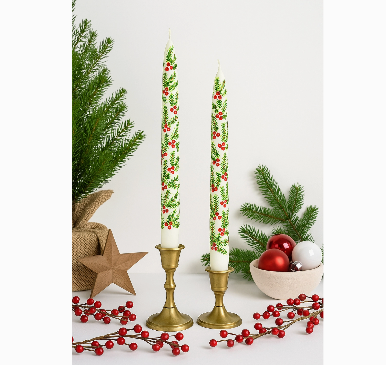 Christmas Pine Needles and Berries Taper Candles Set