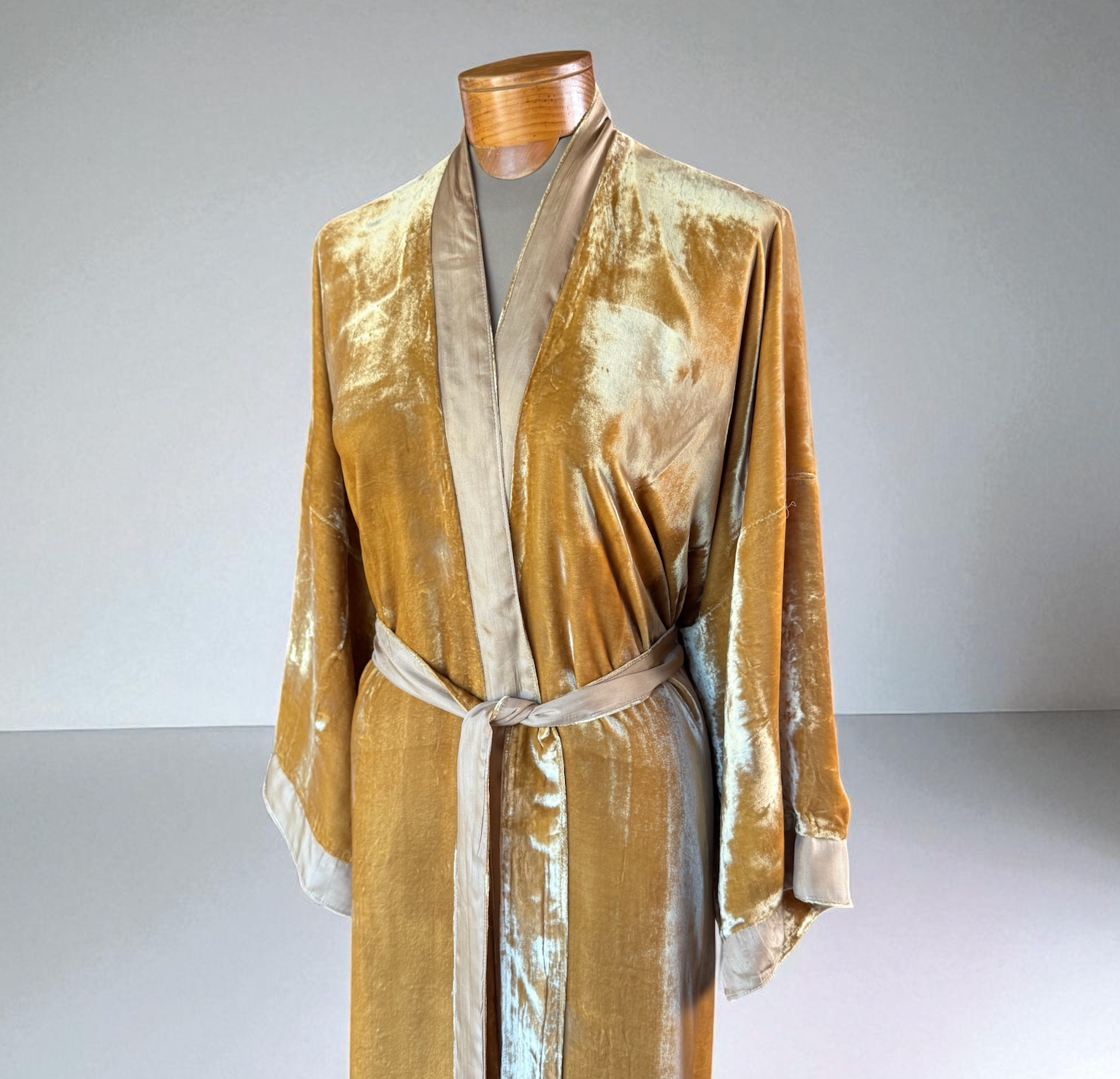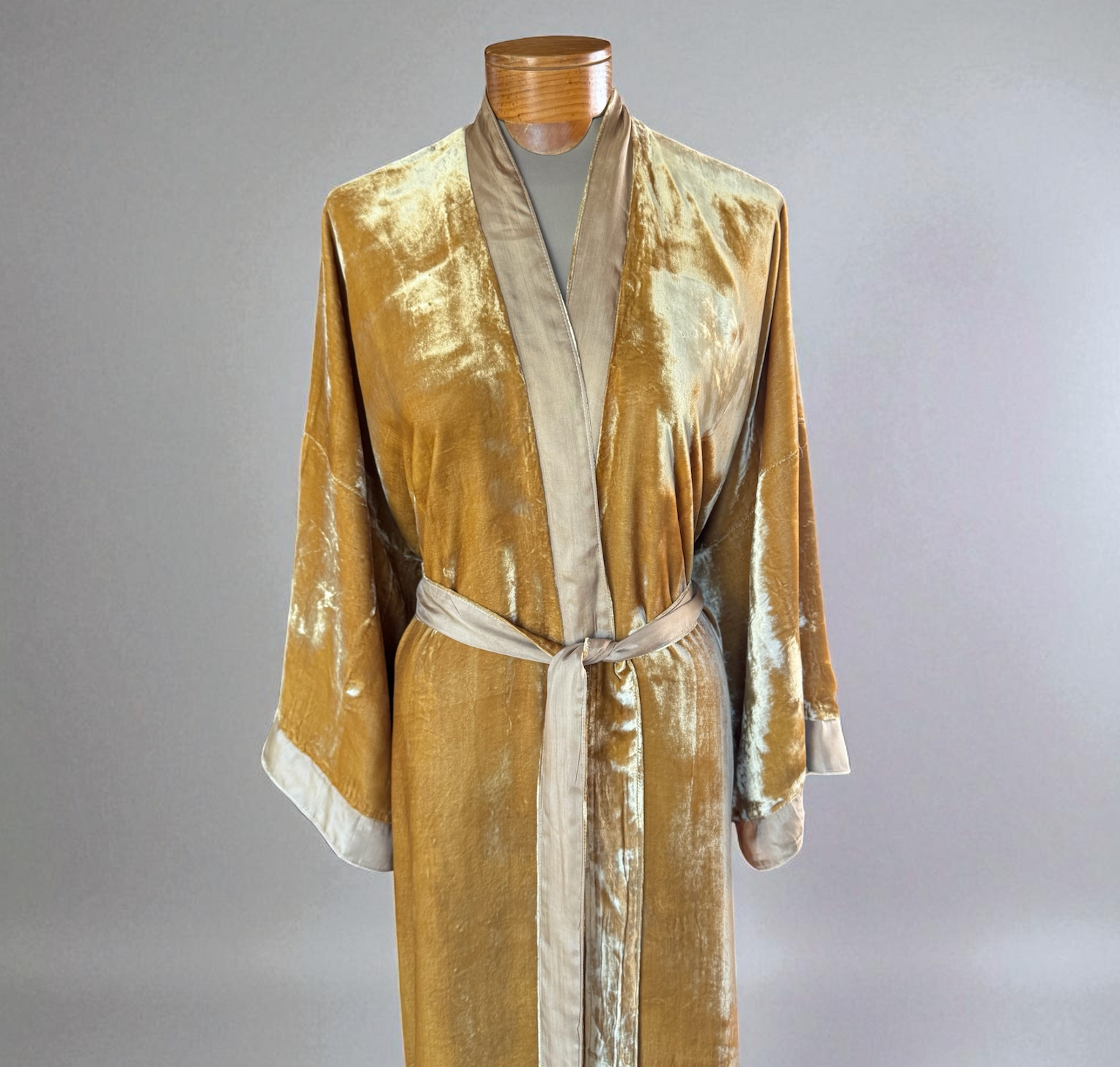 Reversible fine silk velvet robes from Vietnam. They are velvet on one side and silk on the other.