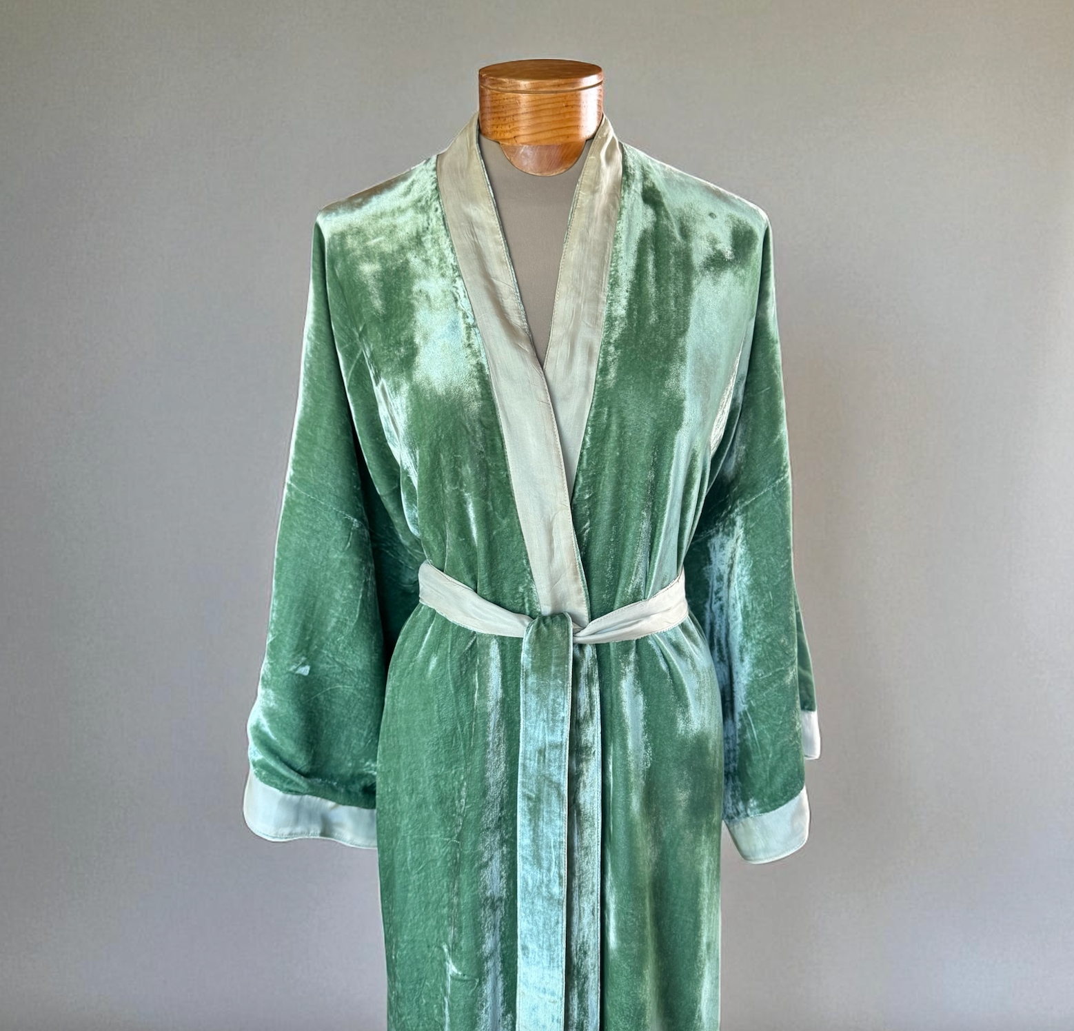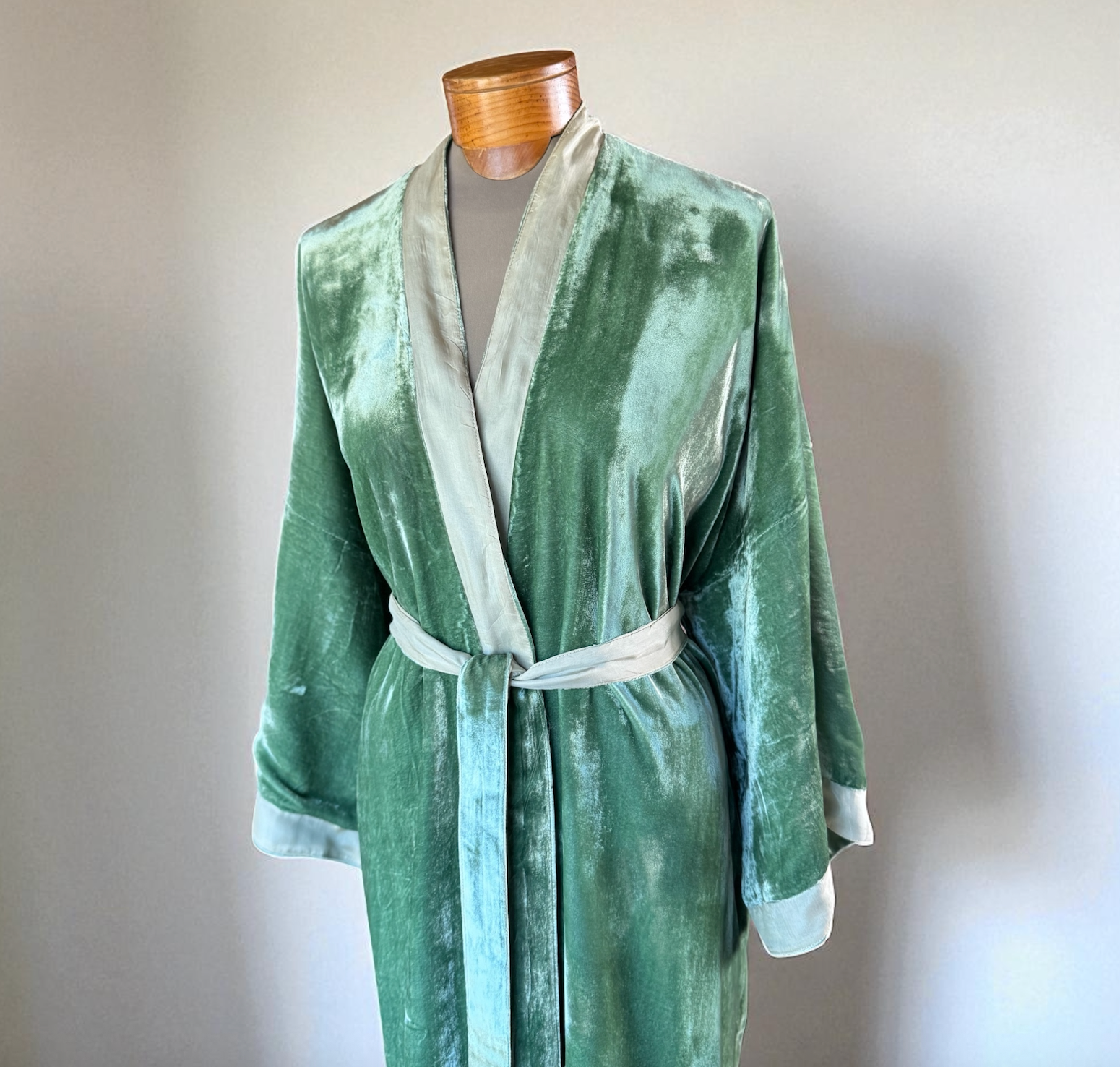 Reversible fine silk velvet robes from Vietnam. They are velvet on one side and silk on the other.
