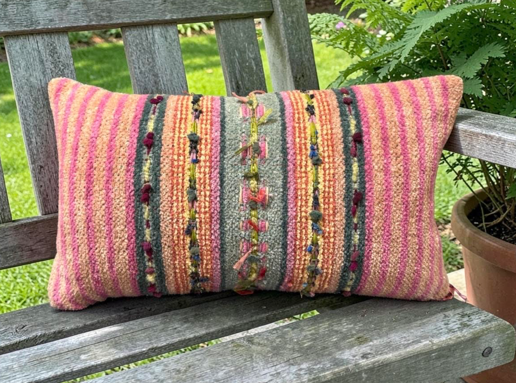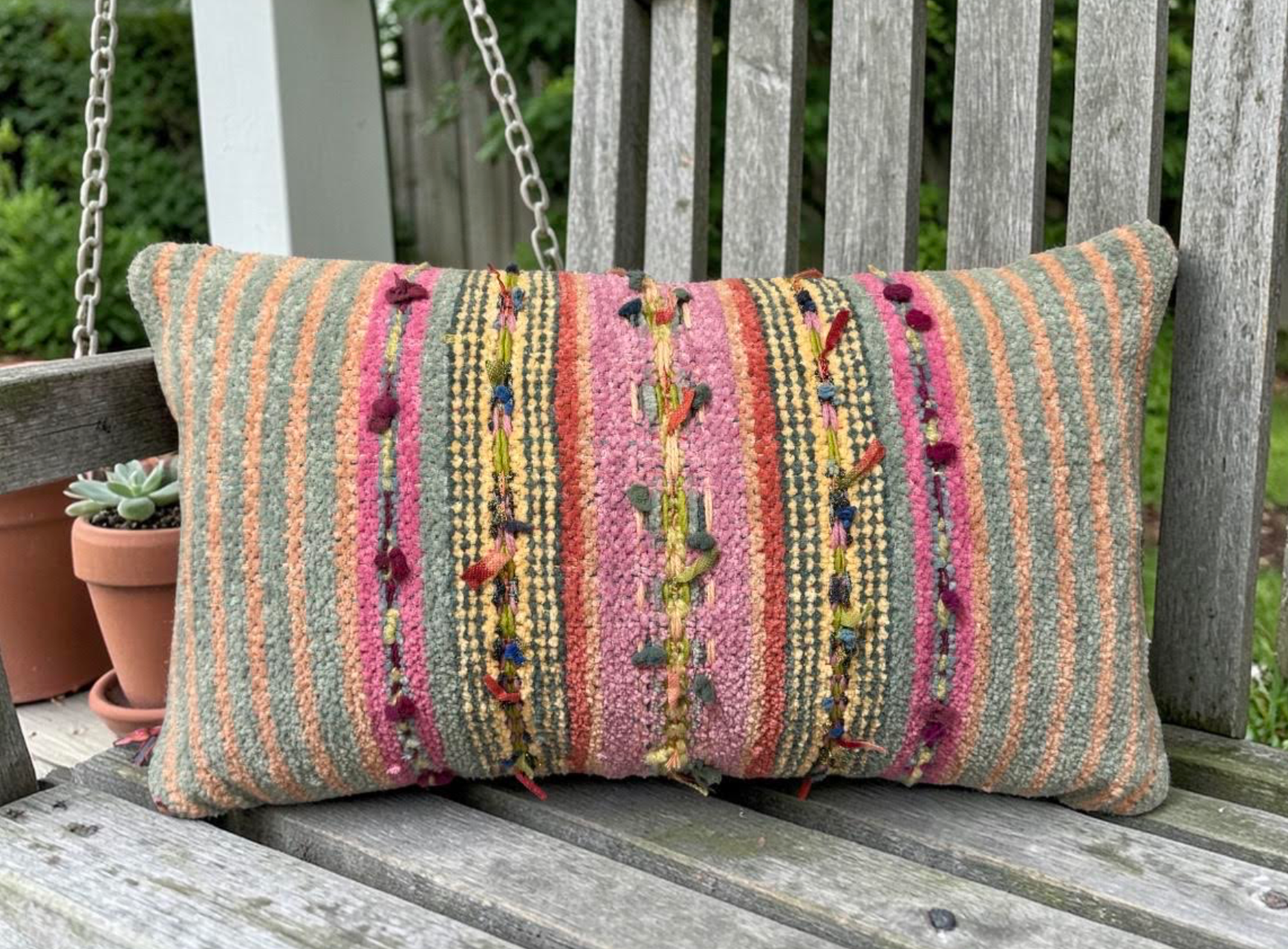 Gretel Underwood "Dos Lados Rosa y Sage" pillow handmade in Santa Fe, NM
