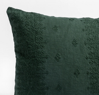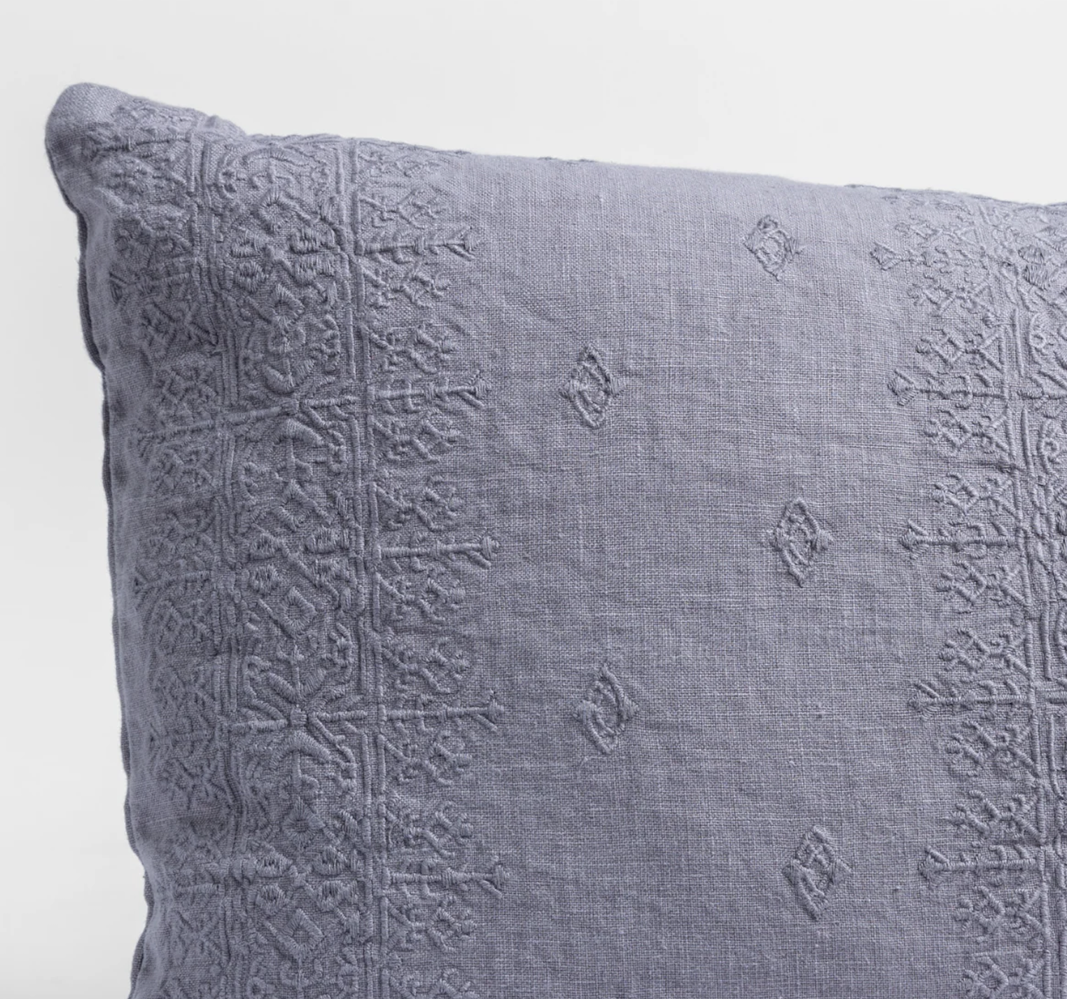 - Embroidered midweight linen with knife edge and linen back, corner snaps for insert, tie closure.