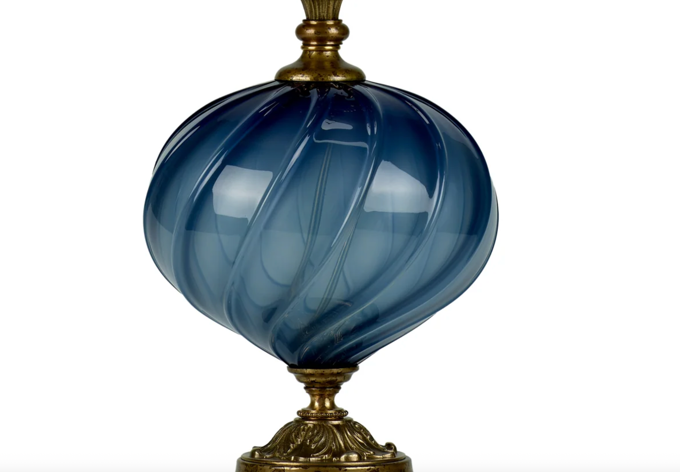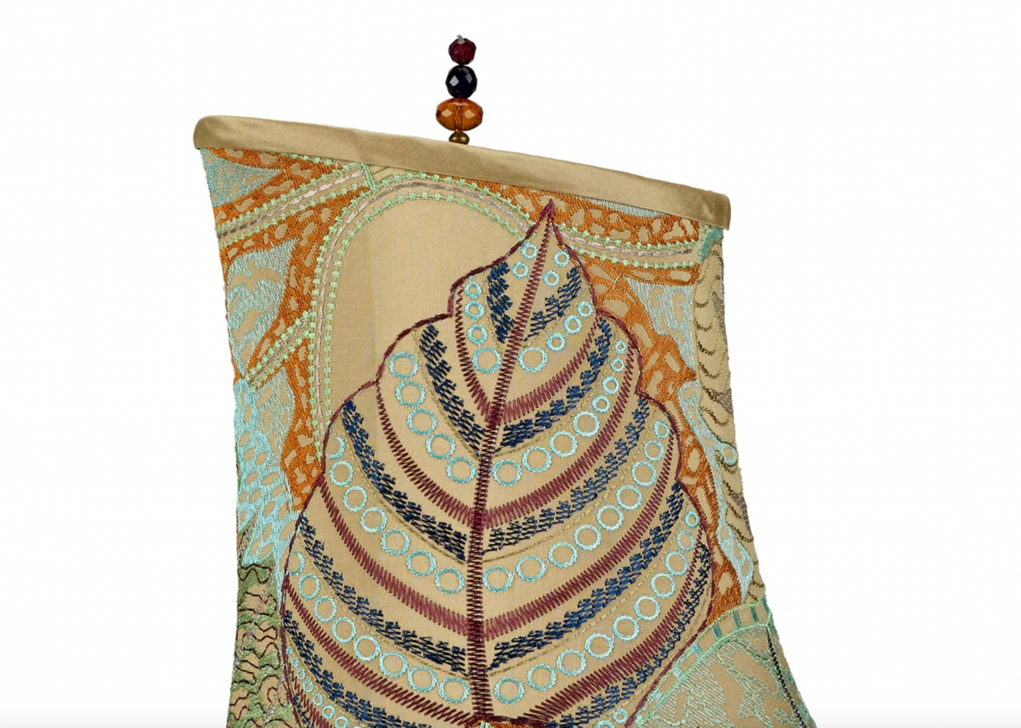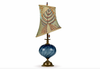 Isla (blue) is a charming lamp with blue blown glass matched with an asymmetric shade covered with silk fabric with an abstract botanical design. The colors in the shade include sea foam, copper, purple, gold and blue. Isla has a single bulb socket and is finished with a beaded finial.