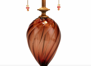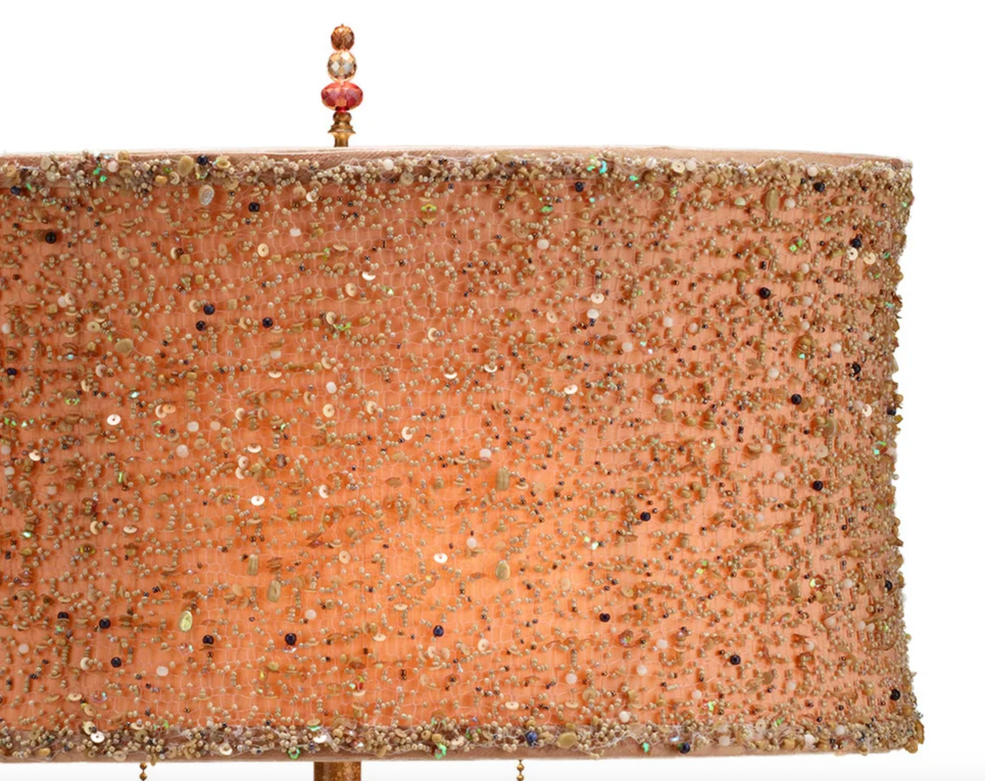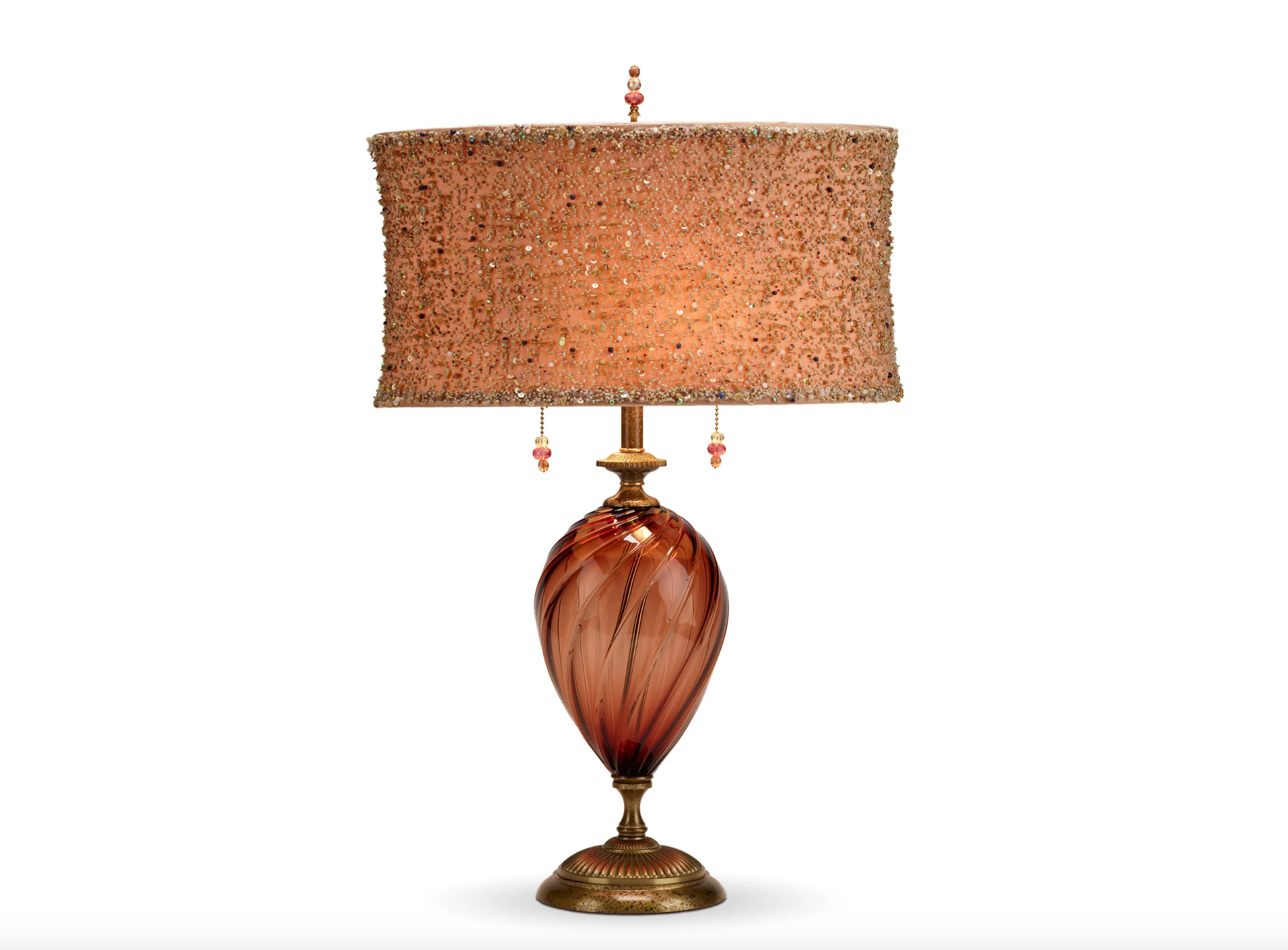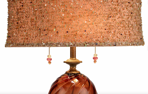 Linda has richly colored burgundy blown glass and a oval shade covered with peach colored dupioni with an elegant beaded overlay. Linda has a double bulb socket and is finished with beaded pulls and a beaded finial.