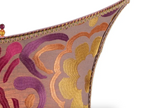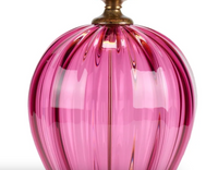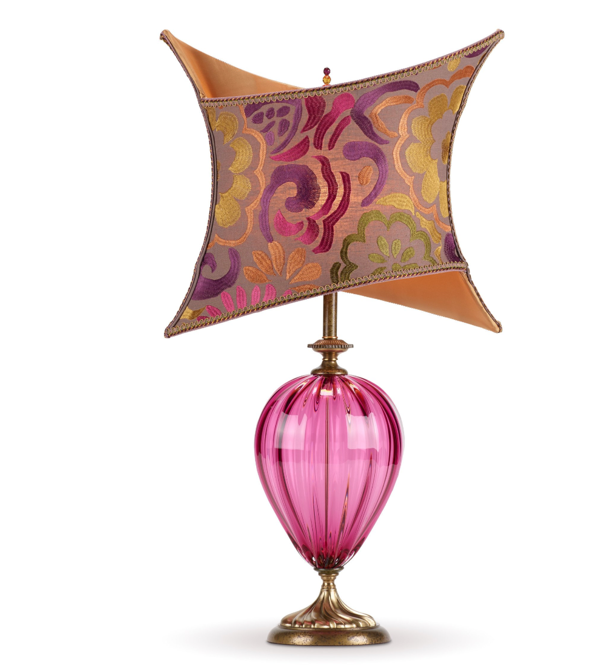 Nadia is a striking table lamp with raspberry colored blown glass and an envelope shaped shade covered in embroidered linen fabric in purple, raspberry, green, gold and copper colors. Nadia has a single bulb socket and is finished with a beaded finial.