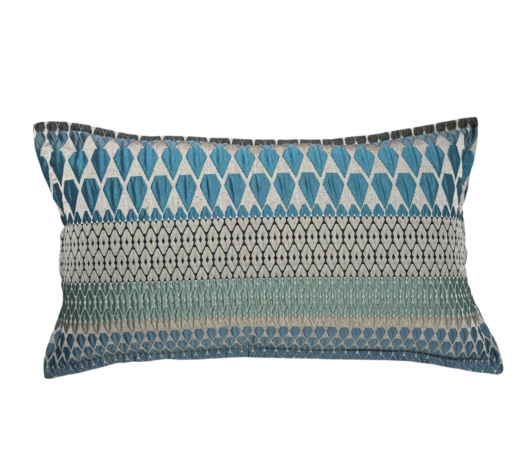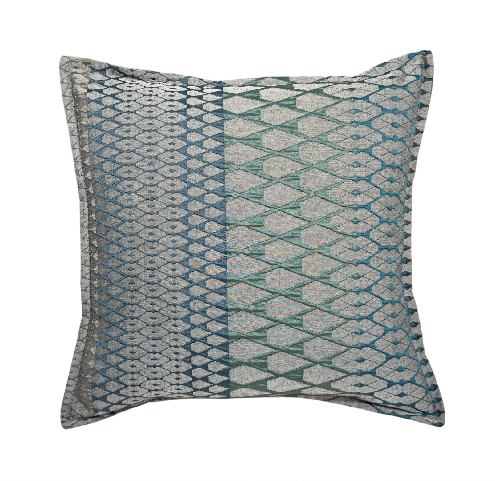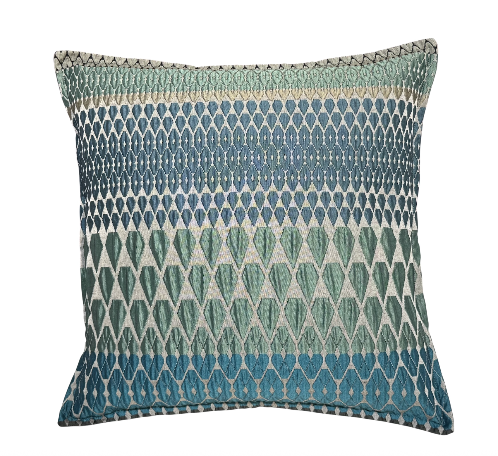 Inspired by the forms of cut glass, and woven in harmonious variations of forest colors, Bailey comprises distinct geometric motifs, of varying scales. The textural quality of this fabric is achieved through a double-weave process; interwoven mixed fibers, including a heat-shrink yarn, create a tension in the cloth for an embossed surface.