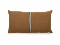 It’s a collection of pillows & bags in a warm oak color with a gray blue & dusty off-white striped trim.