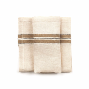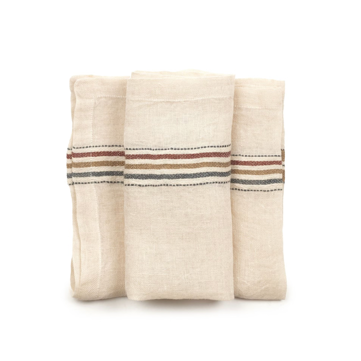 It features our classic LH open weave quality in a dusty off-white color, accented with various stripes in warm oak, rusty brown, and gray blue.